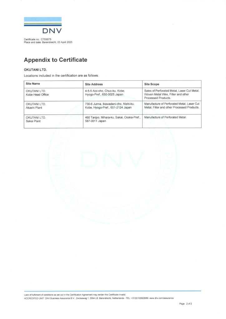 お知らせ 金網製品一覧 織金網 平織金網 平織金網網目一覧表 綾織金網 綾織金網網目一覧表 特殊線材メッシュ網目一覧 マグネステン®金網 マグネステン®金網網目一覧表 平畳織金網 綾畳織金網 クリンプ織金網 ロッククリンプ織金網 フラットトップ織金網(滑面式金網) トンキャップ織金網(長目金網) タイロッド織金網 振動篩用金網について JIS試験用ふるい ワイヤーネットコンベヤー 菱形金網 亀甲金網 装飾用織金網 ワイヤーゲージ(線番) 織金網加工品 パンチングメタル(打抜金網) 金型パターン 在庫リスト 造粒機及び粉砕機用 遠心分離機用 スーパーパンチング™SUPER PUNCHING™ スーパーパンチング™標準金型リスト スーパーパンチング™在庫リスト ODSサニタリーストレーナー™ 二相ステンレス鋼パンチングメタル™ 耐摩耗鋼板HARDOX® エンボス・ディンプル加工 樹脂パンチング™(プラスチックパンチング) セレクト カラー・サイズ樹脂パンチング™(PVC)オーダーシート CFRTP(炭素繊維強化熱可塑性樹脂)パンチング™ 大開孔率パンチング™(X-OPEN AREA PUNCHING) C.G.P/コンピューターグラフィックパンチング 開孔率自動計算(%) 重量自動計算(kg) パンチングメタル加工品 エキスパンドメタル・グレーチング エキスパンドメタル CFRTP EXメッシュ『CF TON』 グレーチング ワイヤーメッシュデミスター・充填物 ワイヤーメッシュデミスター 蒸留用填充物 デミスター加工品 溶接金網・ファインメッシュ 溶接金網 ファインメッシュ ファインメッシュ加工品 微細孔加工・放電加工 電子ビームドリル加工 EBD電子ビームドリル加工 参考データ 多軸同時・微細ドリリング・ルーター・ザグリ加工(金型レス) レーザースクリーン 再生プラスチック用 再生プラスチック用レーザーフィルター 造粒機用消耗部品 粉砕機用消耗部品 ウェッジワイヤースクリーン 業界・用途機能・製品検索 プラント 用途を選択 分離 滑り止め 摺動性 洗浄 保護 生産の効率化 補強 ふるい分け・選別 搬送 採光 整流・乱流 磁性 放熱・排熱 型付け 錆から守る 鉄鋼 用途を選択 分離 滑り止め 洗浄 保護 生産の効率化 補強 ふるい分け・選別 搬送 採光 磁性 受ける 錆から守る 鉱業 用途を選択 分離 滑り止め 摺動性 洗浄 保護 生産の効率化 補強 ふるい分け・選別 搬送 磁性 受ける 錆から守る 機械・造船 用途を選択 分離 滑り止め 摺動性 洗浄 保護 生産の効率化 ふるい分け・選別 搬送 整流・乱流 磁性 放熱・排熱 型付け 調理(揚げ・蒸し) 受ける 押出し成型 錆から守る 減少させる(音・光等) 自動車 用途を選択 分離 洗浄 保護 装飾 生産の効率化 搬送 整流・乱流 放熱・排熱 錆から守る 電機・電子部品 用途を選択 分離 摺動性 洗浄 保護 装飾 生産の効率化 ふるい分け・選別 搬送 放熱・排熱 型付け 錆から守る 航空宇宙 用途を選択 分離 洗浄 保護 生産の効率化 補強 整流・乱流 放熱・排熱 錆から守る 薬品 用途を選択 分離 摺動性 洗浄 保護 生産の効率化 ふるい分け・選別 搬送 整流・乱流 磁性 放熱・排熱 受ける 押出し成型 錆から守る 化学 用途を選択 分離 摺動性 洗浄 保護 生産の効率化 ふるい分け・選別 搬送 整流・乱流 磁性 放熱・排熱 受ける 押出し成型 錆から守る 食品 用途を選択 分離 滑り止め 摺動性 洗浄 保護 生産の効率化 ふるい分け・選別 搬送 整流・乱流 磁性 放熱・排熱 型付け 調理(揚げ・蒸し) 受ける 押出し成型 錆から守る 飲料 用途を選択 分離 滑り止め 摺動性 洗浄 保護 生産の効率化 ふるい分け・選別 搬送 整流・乱流 磁性 放熱・排熱 受ける 錆から守る 農業 用途を選択 分離 摺動性 洗浄 保護 生産の効率化 ふるい分け・選別 搬送 採光 受ける 錆から守る 環境 用途を選択 分離 滑り止め 摺動性 洗浄 保護 生産の効率化 ふるい分け・選別 搬送 磁性 受ける 錆から守る エネルギー 用途を選択 分離 摺動性 洗浄 保護 生産の効率化 補強 ふるい分け・選別 搬送 整流・乱流 放熱・排熱 錆から守る 水処理 用途を選択 分離 滑り止め 摺動性 洗浄 保護 生産の効率化 ふるい分け・選別 整流・乱流 磁性 受ける 錆から守る リサイクル 用途を選択 分離 滑り止め 摺動性 洗浄 保護 生産の効率化 ふるい分け・選別 搬送 整流・乱流 磁性 受ける 押出し成型 錆から守る 建築・土木 用途を選択 分離 滑り止め 摺動性 保護 装飾 生産の効率化 補強 ふるい分け・選別 搬送 採光 放熱・排熱 受ける 錆から守る 減少させる(音・光等) 電子カタログ 注文見積り お問い合わせ 採用情報 会社概要 Home > お知らせ > 2025年4月3日(木) ISO14001を取得しました。(神戸本社・明石工場・堺工場) 2025年4月3日(木) ISO14001を取得しました。(神戸本社・明石工場・堺工場) 公開日:2025.04.23 2025年4月3日(木)ISO14001認証取得しました。(神戸本社・明石工場・堺工場) 最新の記事 2025年12月19日(金) 業務時間変更のご 2025年11月15日(土) 第2回 全社一斉 2025年11月19日付 鉄鋼新聞に『奥谷金網 2025年11月13日付 鉄鋼新聞に『創業13 2025年11月11日付 日刊産業新聞に『奥谷 年別アーカイブ 2025年 2024年 2023年 2022年 2021