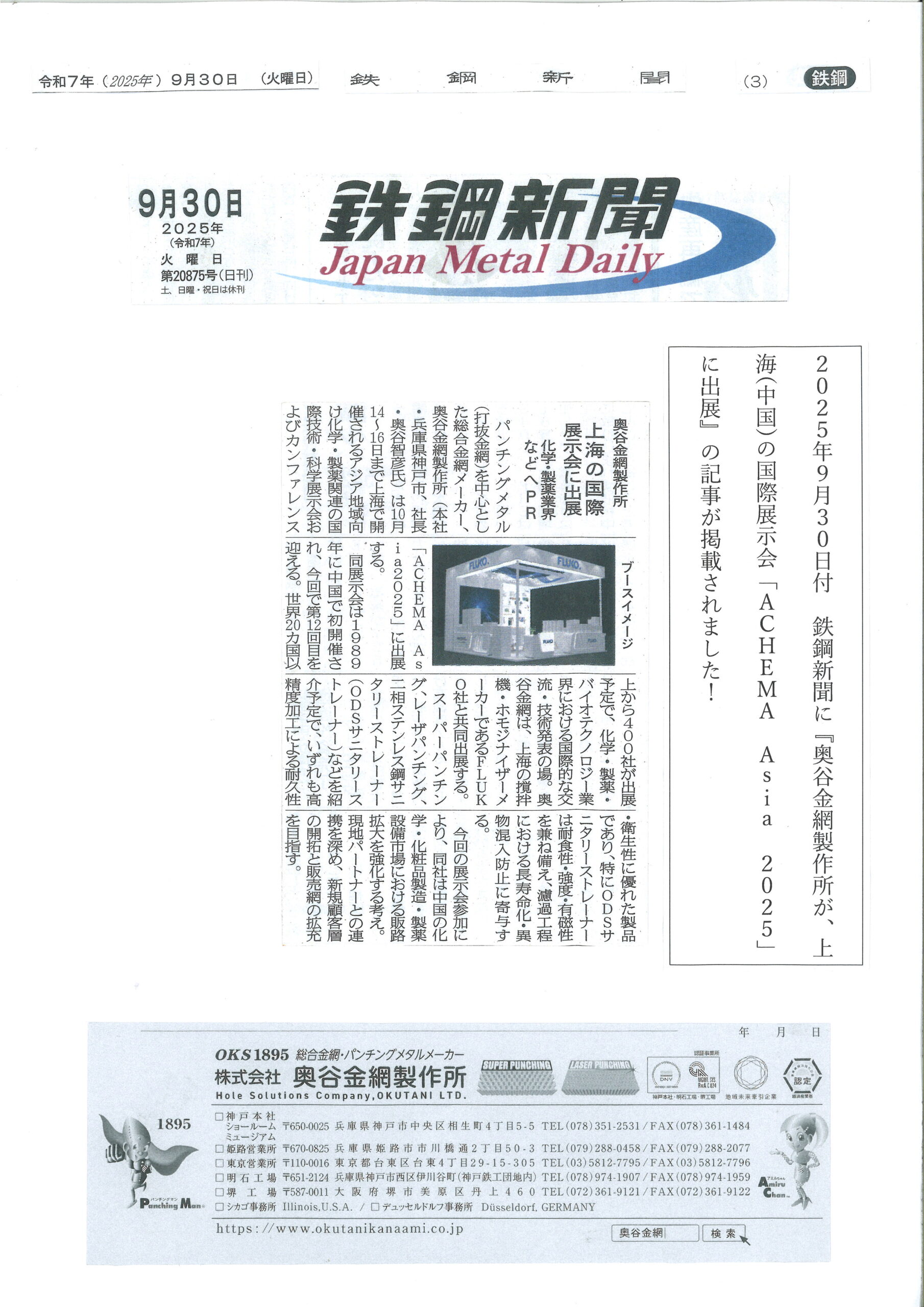 2025年9月30日付 鉄鋼新聞に『奥谷金網製作所が、上海(中国)の国際展示会「ACHEMA Asia 2025」に出展』の記事が掲載されました!