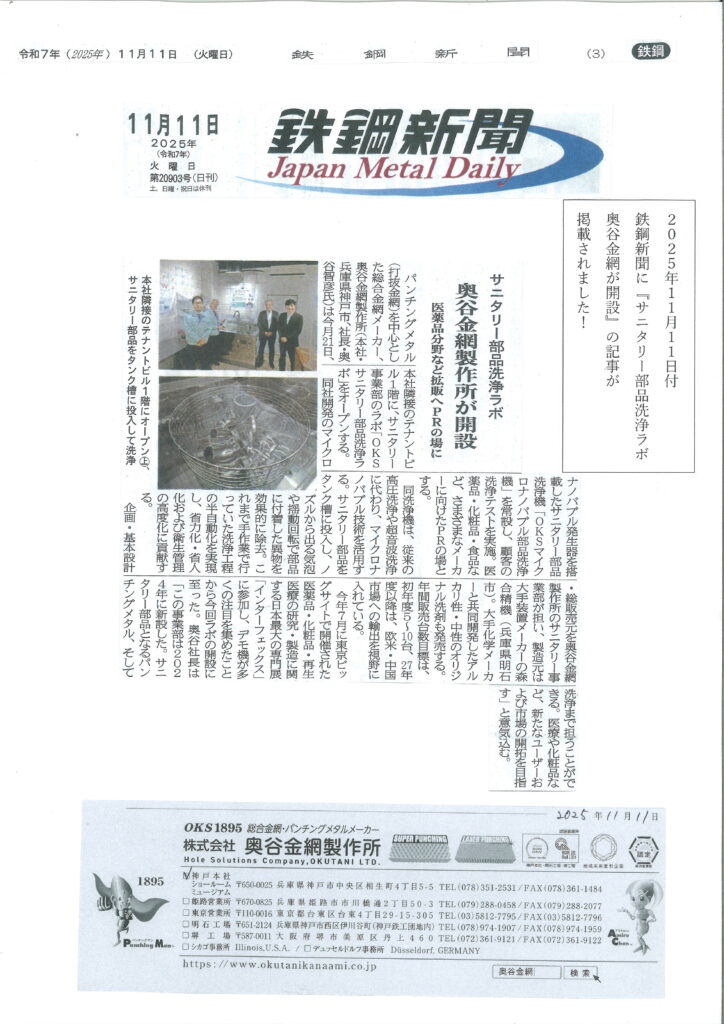 マスコミ掲載 金網製品一覧 織金網 平織金網 平織金網網目一覧表 綾織金網 綾織金網網目一覧表 特殊線材メッシュ網目一覧 マグネステン®金網 マグネステン®金網網目一覧表 平畳織金網 綾畳織金網 クリンプ織金網 ロッククリンプ織金網 フラットトップ織金網(滑面式金網) トンキャップ織金網(長目金網) タイロッド織金網 振動篩用金網について JIS試験用ふるい ワイヤーネットコンベヤー 菱形金網 亀甲金網 装飾用織金網 ワイヤーゲージ(線番) 織金網加工品 パンチングメタル(打抜金網) 金型パターン 在庫リスト 造粒機及び粉砕機用 遠心分離機用 スーパーパンチング™SUPER PUNCHING™ スーパーパンチング™標準金型リスト スーパーパンチング™在庫リスト ODSサニタリーストレーナー™ 二相ステンレス鋼パンチングメタル™ 耐摩耗鋼板HARDOX® エンボス・ディンプル加工 樹脂パンチング™(プラスチックパンチング) セレクト カラー・サイズ樹脂パンチング™(PVC)オーダーシート CFRTP(炭素繊維強化熱可塑性樹脂)パンチング™ 大開孔率パンチング™(X-OPEN AREA PUNCHING) C.G.P/コンピューターグラフィックパンチング 開孔率自動計算(%) 重量自動計算(kg) パンチングメタル加工品 エキスパンドメタル・グレーチング エキスパンドメタル CFRTP EXメッシュ『CF TON』 グレーチング ワイヤーメッシュデミスター・充填物 ワイヤーメッシュデミスター 蒸留用填充物 デミスター加工品 溶接金網・ファインメッシュ 溶接金網 ファインメッシュ ファインメッシュ加工品 微細孔加工・放電加工 電子ビームドリル加工 EBD電子ビームドリル加工 参考データ 多軸同時・微細ドリリング・ルーター・ザグリ加工(金型レス) レーザースクリーン 再生プラスチック用 再生プラスチック用レーザーフィルター 造粒機用消耗部品 粉砕機用消耗部品 ウェッジワイヤースクリーン 業界・用途機能・製品検索 プラント 用途を選択 分離 滑り止め 摺動性 洗浄 保護 生産の効率化 補強 ふるい分け・選別 搬送 採光 整流・乱流 磁性 放熱・排熱 型付け 錆から守る 鉄鋼 用途を選択 分離 滑り止め 洗浄 保護 生産の効率化 補強 ふるい分け・選別 搬送 採光 磁性 受ける 錆から守る 鉱業 用途を選択 分離 滑り止め 摺動性 洗浄 保護 生産の効率化 補強 ふるい分け・選別 搬送 磁性 受ける 錆から守る 機械・造船 用途を選択 分離 滑り止め 摺動性 洗浄 保護 生産の効率化 ふるい分け・選別 搬送 整流・乱流 磁性 放熱・排熱 型付け 調理(揚げ・蒸し) 受ける 押出し成型 錆から守る 減少させる(音・光等) 自動車 用途を選択 分離 洗浄 保護 装飾 生産の効率化 搬送 整流・乱流 放熱・排熱 錆から守る 電機・電子部品 用途を選択 分離 摺動性 洗浄 保護 装飾 生産の効率化 ふるい分け・選別 搬送 放熱・排熱 型付け 錆から守る 航空宇宙 用途を選択 分離 洗浄 保護 生産の効率化 補強 整流・乱流 放熱・排熱 錆から守る 薬品 用途を選択 分離 摺動性 洗浄 保護 生産の効率化 ふるい分け・選別 搬送 整流・乱流 磁性 放熱・排熱 受ける 押出し成型 錆から守る 化学 用途を選択 分離 摺動性 洗浄 保護 生産の効率化 ふるい分け・選別 搬送 整流・乱流 磁性 放熱・排熱 受ける 押出し成型 錆から守る 食品 用途を選択 分離 滑り止め 摺動性 洗浄 保護 生産の効率化 ふるい分け・選別 搬送 整流・乱流 磁性 放熱・排熱 型付け 調理(揚げ・蒸し) 受ける 押出し成型 錆から守る 飲料 用途を選択 分離 滑り止め 摺動性 洗浄 保護 生産の効率化 ふるい分け・選別 搬送 整流・乱流 磁性 放熱・排熱 受ける 錆から守る 農業 用途を選択 分離 摺動性 洗浄 保護 生産の効率化 ふるい分け・選別 搬送 採光 受ける 錆から守る 環境 用途を選択 分離 滑り止め 摺動性 洗浄 保護 生産の効率化 ふるい分け・選別 搬送 磁性 受ける 錆から守る エネルギー 用途を選択 分離 摺動性 洗浄 保護 生産の効率化 補強 ふるい分け・選別 搬送 整流・乱流 放熱・排熱 錆から守る 水処理 用途を選択 分離 滑り止め 摺動性 洗浄 保護 生産の効率化 ふるい分け・選別 整流・乱流 磁性 受ける 錆から守る リサイクル 用途を選択 分離 滑り止め 摺動性 洗浄 保護 生産の効率化 ふるい分け・選別 搬送 整流・乱流 磁性 受ける 押出し成型 錆から守る 建築・土木 用途を選択 分離 滑り止め 摺動性 保護 装飾 生産の効率化 補強 ふるい分け・選別 搬送 採光 放熱・排熱 受ける 錆から守る 減少させる(音・光等) 電子カタログ 注文見積り お問い合わせ 採用情報 会社概要 Home > お知らせ > マスコミ掲載 > 2025年11月11日付 鉄鋼新聞に『サニタリー部品洗浄ラボ 奥谷金網が開設』の記事が掲載されました! 2025年11月11日付 鉄鋼新聞に『サニタリー部品洗浄ラボ 奥谷金網が開設』の記事が掲載されました! 公開日:2025.11.27 2025年11月11日付 鉄鋼新聞に『サニタリー部品洗浄ラボ 奥谷金網が開設』の記事が掲載されました! ●PDFで大きくご覧いただけます。PDFファイル(記事PDF:2MB) 最新の記事 2025年11月11日付 日刊産業新聞に『奥谷 2025年11月11日付 鉄鋼新聞に『