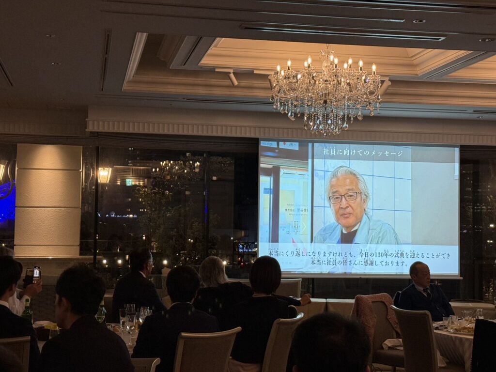 楽しいイベントの次は、130年記念動画を放映。創業から現在までの軌跡をたどりました。