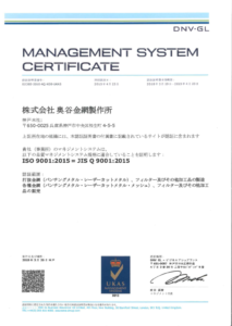 iso2018-1 金網製品一覧 織金網 平織金網 平織金網網目一覧表 綾織金網 綾織金網網目一覧表 特殊線材メッシュ網目一覧 マグネステン®金網 マグネステン®金網網目一覧表 平畳織金網 綾畳織金網 クリンプ織金網 ロッククリンプ織金網 フラットトップ織金網(滑面式金網) トンキャップ織金網(長目金網) タイロッド織金網 振動篩用金網について JIS試験用ふるい ワイヤーネットコンベヤー 菱形金網 亀甲金網 装飾用織金網 ワイヤーゲージ(線番) 織金網加工品 パンチングメタル(打抜金網) 金型パターン 在庫リスト 造粒機及び粉砕機用 遠心分離機用 スーパーパンチング™SUPER PUNCHING™ スーパーパンチング™標準金型リスト スーパーパンチング™在庫リスト ODSサニタリーストレーナー™ 二相ステンレス鋼パンチングメタル™ 耐摩耗鋼板HARDOX® エンボス・ディンプル加工 樹脂パンチング™(プラスチックパンチング) セレクト カラー・サイズ樹脂パンチング™(PVC)オーダーシート CFRTP(炭素繊維強化熱可塑性樹脂)パンチング™ 大開孔率パンチング™(X-OPEN AREA PUNCHING) C.G.P/コンピューターグラフィックパンチング 開孔率自動計算(%) 重量自動計算(kg) パンチングメタル加工品 エキスパンドメタル・グレーチング エキスパンドメタル CFRTP EXメッシュ『CF TON』 グレーチング ワイヤーメッシュデミスター・充填物 ワイヤーメッシュデミスター 蒸留用填充物 デミスター加工品 溶接金網・ファインメッシュ 溶接金網 ファインメッシュ ファインメッシュ加工品 微細孔加工・放電加工 電子ビームドリル加工 EBD電子ビームドリル加工 参考データ 多軸同時・微細ドリリング・ルーター・ザグリ加工(金型レス) レーザースクリーン 再生プラスチック用 再生プラスチック用レーザーフィルター 造粒機用消耗部品 粉砕機用消耗部品 ウェッジワイヤースクリーン 業界・用途機能・製品検索 プラント 用途を選択 分離 滑り止め 摺動性 洗浄 保護 生産の効率化 補強 ふるい分け・選別 搬送 採光 整流・乱流 磁性 放熱・排熱 型付け 錆から守る 鉄鋼 用途を選択 分離 滑り止め 洗浄 保護 生産の効率化 補強 ふるい分け・選別 搬送 採光 磁性 受ける 錆から守る 鉱業 用途を選択 分離 滑り止め 摺動性 洗浄 保護 生産の効率化 補強 ふるい分け・選別 搬送 磁性 受ける 錆から守る 機械・造船 用途を選択 分離 滑り止め 摺動性 洗浄 保護 生産の効率化 ふるい分け・選別 搬送 整流・乱流 磁性 放熱・排熱 型付け 調理(揚げ・蒸し) 受ける 押出し成型 錆から守る 減少させる(音・光等) 自動車 用途を選択 分離 洗浄 保護 装飾 生産の効率化 搬送 整流・乱流 放熱・排熱 錆から守る 電機・電子部品 用途を選択 分離 摺動性 洗浄 保護 装飾 生産の効率化 ふるい分け・選別 搬送 放熱・排熱 型付け 錆から守る 航空宇宙 用途を選択 分離 洗浄 保護 生産の効率化 補強 整流・乱流 放熱・排熱 錆から守る 薬品 用途を選択 分離 摺動性 洗浄 保護 生産の効率化 ふるい分け・選別 搬送 整流・乱流 磁性 放熱・排熱 受ける 押出し成型 錆から守る 化学 用途を選択 分離 摺動性 洗浄 保護 生産の効率化 ふるい分け・選別 搬送 整流・乱流 磁性 放熱・排熱 受ける 押出し成型 錆から守る 食品 用途を選択 分離 滑り止め 摺動性 洗浄 保護 生産の効率化 ふるい分け・選別 搬送 整流・乱流 磁性 放熱・排熱 型付け 調理(揚げ・蒸し) 受ける 押出し成型 錆から守る 飲料 用途を選択 分離 滑り止め 摺動性 洗浄 保護 生産の効率化 ふるい分け・選別 搬送 整流・乱流 磁性 放熱・排熱 受ける 錆から守る 農業 用途を選択 分離 摺動性 洗浄 保護 生産の効率化 ふるい分け・選別 搬送 採光 受ける 錆から守る 環境 用途を選択 分離 滑り止め 摺動性 洗浄 保護 生産の効率化 ふるい分け・選別 搬送 磁性 受ける 錆から守る エネルギー 用途を選択 分離 摺動性 洗浄 保護 生産の効率化 補強 ふるい分け・選別 搬送 整流・乱流 放熱・排熱 錆から守る 水処理 用途を選択 分離 滑り止め 摺動性 洗浄 保護 生産の効率化 ふるい分け・選別 整流・乱流 磁性 受ける 錆から守る リサイクル 用途を選択 分離 滑り止め 摺動性 洗浄 保護 生産の効率化 ふるい分け・選別 搬送 整流・乱流 磁性 受ける 押出し成型 錆から守る 建築・土木 用途を選択 分離 滑り止め 摺動性 保護 装飾 生産の効率化 補強 ふるい分け・選別 搬送 採光 放熱・排熱 受ける 錆から守る 減少させる(音・光等) 電子カタログ 注文見積り お問い合わせ 採用情報 会社概要 Home > お知らせ > 2016年3月7日(火)ISO9001認証取得(更新)しました。(神戸本社・明石工場・堺工場) > iso2018-1