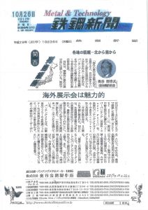 171026 金網製品一覧 織金網 平織金網 平織金網網目一覧表 綾織金網 綾織金網網目一覧表 特殊線材メッシュ網目一覧 マグネステン®金網 マグネステン®金網網目一覧表 平畳織金網 綾畳織金網 クリンプ織金網 ロッククリンプ織金網 フラットトップ織金網(滑面式金網) トンキャップ織金網(長目金網) タイロッド織金網 振動篩用金網について JIS試験用ふるい ワイヤーネットコンベヤー 菱形金網 亀甲金網 装飾用織金網 ワイヤーゲージ(線番) 織金網加工品 パンチングメタル(打抜金網) 金型パターン 在庫リスト 造粒機及び粉砕機用 遠心分離機用 スーパーパンチング™SUPER PUNCHING™ スーパーパンチング™標準金型リスト スーパーパンチング™在庫リスト ODSサニタリーストレーナー™ 二相ステンレス鋼パンチングメタル™ 耐摩耗鋼板HARDOX® エンボス・ディンプル加工 樹脂パンチング™(プラスチックパンチング) セレクト カラー・サイズ樹脂パンチング™(PVC)オーダーシート CFRTP(炭素繊維強化熱可塑性樹脂)パンチング™ 大開孔率パンチング™(X-OPEN AREA PUNCHING) C.G.P/コンピューターグラフィックパンチング 開孔率自動計算(%) 重量自動計算(kg) パンチングメタル加工品 エキスパンドメタル・グレーチング エキスパンドメタル CFRTP EXメッシュ『CF TON』 グレーチング ワイヤーメッシュデミスター・充填物 ワイヤーメッシュデミスター 蒸留用填充物 デミスター加工品 溶接金網・ファインメッシュ 溶接金網 ファインメッシュ ファインメッシュ加工品 微細孔加工・放電加工 電子ビームドリル加工 EBD電子ビームドリル加工 参考データ 多軸同時・微細ドリリング・ルーター・ザグリ加工(金型レス) レーザースクリーン 再生プラスチック用 再生プラスチック用レーザーフィルター 造粒機用消耗部品 粉砕機用消耗部品 ウェッジワイヤースクリーン 業界・用途機能・製品検索 プラント 用途を選択 分離 滑り止め 摺動性 洗浄 保護 生産の効率化 補強 ふるい分け・選別 搬送 採光 整流・乱流 磁性 放熱・排熱 型付け 錆から守る 鉄鋼 用途を選択 分離 滑り止め 洗浄 保護 生産の効率化 補強 ふるい分け・選別 搬送 採光 磁性 受ける 錆から守る 鉱業 用途を選択 分離 滑り止め 摺動性 洗浄 保護 生産の効率化 補強 ふるい分け・選別 搬送 磁性 受ける 錆から守る 機械・造船 用途を選択 分離 滑り止め 摺動性 洗浄 保護 生産の効率化 ふるい分け・選別 搬送 整流・乱流 磁性 放熱・排熱 型付け 調理(揚げ・蒸し) 受ける 押出し成型 錆から守る 減少させる(音・光等) 自動車 用途を選択 分離 洗浄 保護 装飾 生産の効率化 搬送 整流・乱流 放熱・排熱 錆から守る 電機・電子部品 用途を選択 分離 摺動性 洗浄 保護 装飾 生産の効率化 ふるい分け・選別 搬送 放熱・排熱 型付け 錆から守る 航空宇宙 用途を選択 分離 洗浄 保護 生産の効率化 補強 整流・乱流 放熱・排熱 錆から守る 薬品 用途を選択 分離 摺動性 洗浄 保護 生産の効率化 ふるい分け・選別 搬送 整流・乱流 磁性 放熱・排熱 受ける 押出し成型 錆から守る 化学 用途を選択 分離 摺動性 洗浄 保護 生産の効率化 ふるい分け・選別 搬送 整流・乱流 磁性 放熱・排熱 受ける 押出し成型 錆から守る 食品 用途を選択 分離 滑り止め 摺動性 洗浄 保護 生産の効率化 ふるい分け・選別 搬送 整流・乱流 磁性 放熱・排熱 型付け 調理(揚げ・蒸し) 受ける 押出し成型 錆から守る 飲料 用途を選択 分離 滑り止め 摺動性 洗浄 保護 生産の効率化 ふるい分け・選別 搬送 整流・乱流 磁性 放熱・排熱 受ける 錆から守る 農業 用途を選択 分離 摺動性 洗浄 保護 生産の効率化 ふるい分け・選別 搬送 採光 受ける 錆から守る 環境 用途を選択 分離 滑り止め 摺動性 洗浄 保護 生産の効率化 ふるい分け・選別 搬送 磁性 受ける 錆から守る エネルギー 用途を選択 分離 摺動性 洗浄 保護 生産の効率化 補強 ふるい分け・選別 搬送 整流・乱流 放熱・排熱 錆から守る 水処理 用途を選択 分離 滑り止め 摺動性 洗浄 保護 生産の効率化 ふるい分け・選別 整流・乱流 磁性 受ける 錆から守る リサイクル 用途を選択 分離 滑り止め 摺動性 洗浄 保護 生産の効率化 ふるい分け・選別 搬送 整流・乱流 磁性 受ける 押出し成型 錆から守る 建築・土木 用途を選択 分離 滑り止め 摺動性 保護 装飾 生産の効率化 補強 ふるい分け・選別 搬送 採光 放熱・排熱 受ける 錆から守る 減少させる(音・光等) 電子カタログ 注文見積り お問い合わせ 採用情報 会社概要 Home > お知らせ > マスコミ掲載 > 2017年10月26日付 『海外展示会は魅力的』の記事が『鉄鋼新聞』に掲載されました。 > 171026