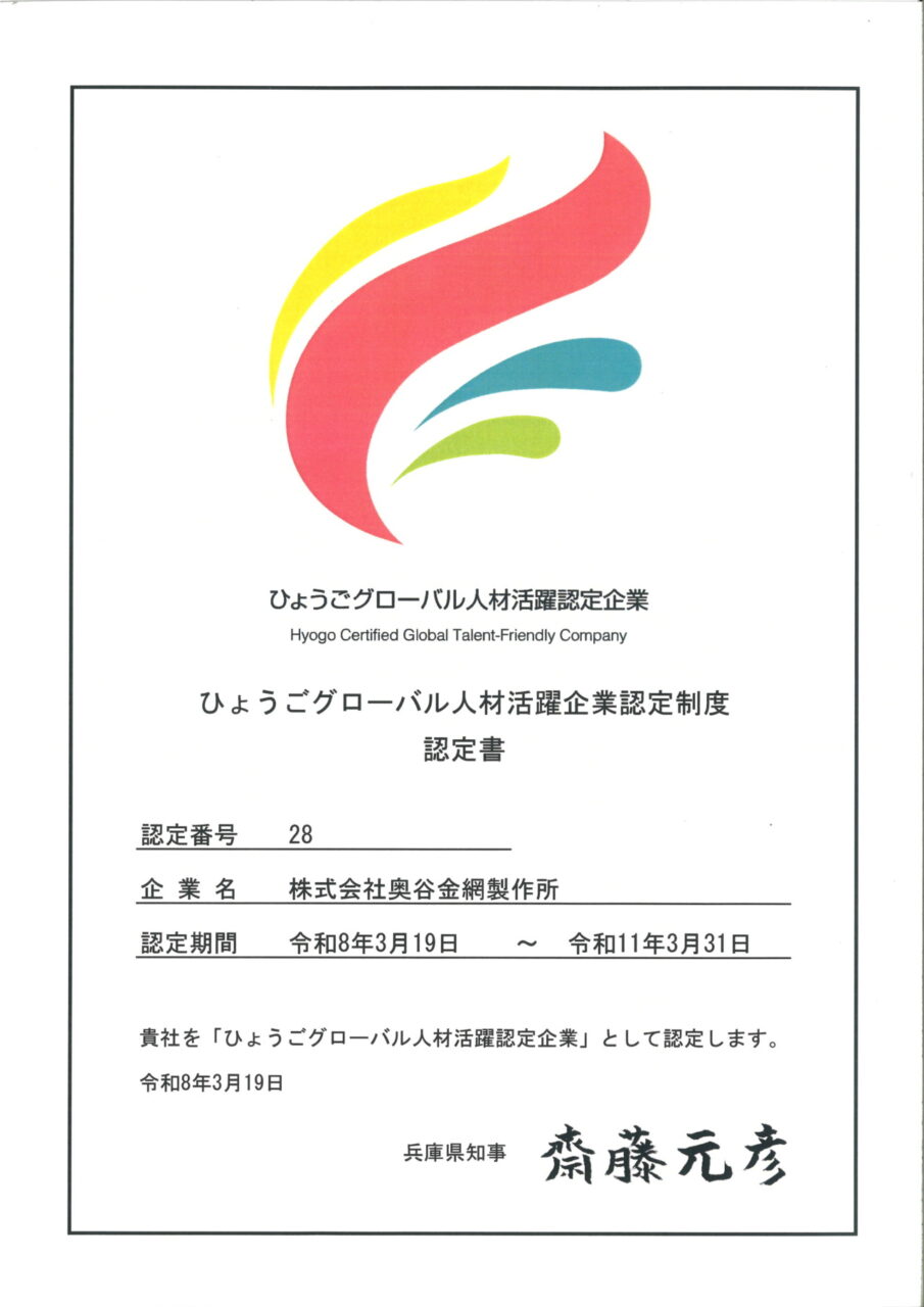 お知らせ 金網製品一覧 織金網 平織金網 平織金網網目一覧表 綾織金網 綾織金網網目一覧表 特殊線材メッシュ網目一覧 マグネステン®金網 マグネステン®金網網目一覧表 平畳織金網 綾畳織金網 クリンプ織金網 ロッククリンプ織金網 フラットトップ織金網(滑面式金網) トンキャップ織金網(長目金網) タイロッド織金網 振動篩用金網について JIS試験用ふるい ワイヤーネットコンベヤー 菱形金網 亀甲金網 装飾用織金網 ワイヤーゲージ(線番) 織金網加工品 パンチングメタル(打抜金網) 金型パターン 在庫リスト 造粒機及び粉砕機用 遠心分離機用 スーパーパンチング™SUPER PUNCHING™ スーパーパンチング™標準金型リスト スーパーパンチング™在庫リスト ODSサニタリーストレーナー™ 二相ステンレス鋼パンチングメタル™ 耐摩耗鋼板HARDOX® エンボス・ディンプル加工 樹脂パンチング™(プラスチックパンチング) セレクト カラー・サイズ樹脂パンチング™(PVC)オーダーシート CFRTP(炭素繊維強化熱可塑性樹脂)パンチング™ 大開孔率パンチング™(X-OPEN AREA PUNCHING) C.G.P/コンピューターグラフィックパンチング 開孔率自動計算(%) 重量自動計算(kg) パンチングメタル加工品 エキスパンドメタル・グレーチング エキスパンドメタル CFRTP EXメッシュ『CF TON』 グレーチング ワイヤーメッシュデミスター・充填物 ワイヤーメッシュデミスター 蒸留用填充物 デミスター加工品 溶接金網・ファインメッシュ 溶接金網 ファインメッシュ ファインメッシュ加工品 微細孔加工・放電加工 電子ビームドリル加工 EBD電子ビームドリル加工 参考データ 多軸同時・微細ドリリング・ルーター・ザグリ加工(金型レス) レーザースクリーン 再生プラスチック用 再生プラスチック用レーザーフィルター 造粒機用消耗部品 粉砕機用消耗部品 ウェッジワイヤースクリーン 業界・用途機能・製品検索 プラント 用途を選択 分離 滑り止め 摺動性 洗浄 保護 生産の効率化 補強 ふるい分け・選別 搬送 採光 整流・乱流 磁性 放熱・排熱 型付け 錆から守る 鉄鋼 用途を選択 分離 滑り止め 洗浄 保護 生産の効率化 補強 ふるい分け・選別 搬送 採光 磁性 受ける 錆から守る 鉱業 用途を選択 分離 滑り止め 摺動性 洗浄 保護 生産の効率化 補強 ふるい分け・選別 搬送 磁性 受ける 錆から守る 機械・造船 用途を選択 分離 滑り止め 摺動性 洗浄 保護 生産の効率化 ふるい分け・選別 搬送 整流・乱流 磁性 放熱・排熱 型付け 調理(揚げ・蒸し) 受ける 押出し成型 錆から守る 減少させる(音・光等) 自動車 用途を選択 分離 洗浄 保護 装飾 生産の効率化 搬送 整流・乱流 放熱・排熱 錆から守る 電機・電子部品 用途を選択 分離 摺動性 洗浄 保護 装飾 生産の効率化 ふるい分け・選別 搬送 放熱・排熱 型付け 錆から守る 航空宇宙 用途を選択 分離 洗浄 保護 生産の効率化 補強 整流・乱流 放熱・排熱 錆から守る 薬品 用途を選択 分離 摺動性 洗浄 保護 生産の効率化 ふるい分け・選別 搬送 整流・乱流 磁性 放熱・排熱 受ける 押出し成型 錆から守る 化学 用途を選択 分離 摺動性 洗浄 保護 生産の効率化 ふるい分け・選別 搬送 整流・乱流 磁性 放熱・排熱 受ける 押出し成型 錆から守る 食品 用途を選択 分離 滑り止め 摺動性 洗浄 保護 生産の効率化 ふるい分け・選別 搬送 整流・乱流 磁性 放熱・排熱 型付け 調理(揚げ・蒸し) 受ける 押出し成型 錆から守る 飲料 用途を選択 分離 滑り止め 摺動性 洗浄 保護 生産の効率化 ふるい分け・選別 搬送 整流・乱流 磁性 放熱・排熱 受ける 錆から守る 農業 用途を選択 分離 摺動性 洗浄 保護 生産の効率化 ふるい分け・選別 搬送 採光 受ける 錆から守る 環境 用途を選択 分離 滑り止め 摺動性 洗浄 保護 生産の効率化 ふるい分け・選別 搬送 磁性 受ける 錆から守る エネルギー 用途を選択 分離 摺動性 洗浄 保護 生産の効率化 補強 ふるい分け・選別 搬送 整流・乱流 放熱・排熱 錆から守る 水処理 用途を選択 分離 滑り止め 摺動性 洗浄 保護 生産の効率化 ふるい分け・選別 整流・乱流 磁性 受ける 錆から守る リサイクル 用途を選択 分離 滑り止め 摺動性 洗浄 保護 生産の効率化 ふるい分け・選別 搬送 整流・乱流 磁性 受ける 押出し成型 錆から守る 建築・土木 用途を選択 分離 滑り止め 摺動性 保護 装飾 生産の効率化 補強 ふるい分け・選別 搬送 採光 放熱・排熱 受ける 錆から守る 減少させる(音・光等) 電子カタログ 注文見積り お問い合わせ 採用情報 会社概要 Home > お知らせ 2026.02.24 社内イベント 2026年2月14日(土)グランフロント大阪にて開催された『マイナビ転職フェア』に参加しました! 2026.01.20 社内イベント 2025年1月16日(金)に神戸サンボーホールにて開催された ㈱学情・神戸市主催:合同就職説明会『KOBE就職・転職フェア』に参加しました。 2026.01.20 お知らせ 2025年12月2日付 韓国国内向けの「SUPER PUNCHING」(ロゴ)が韓国にて商標登録されました! 2026.01.19 社内イベント 2026年1月17日(土) 第32回 マネジメントレビューが明石工場にて開催され